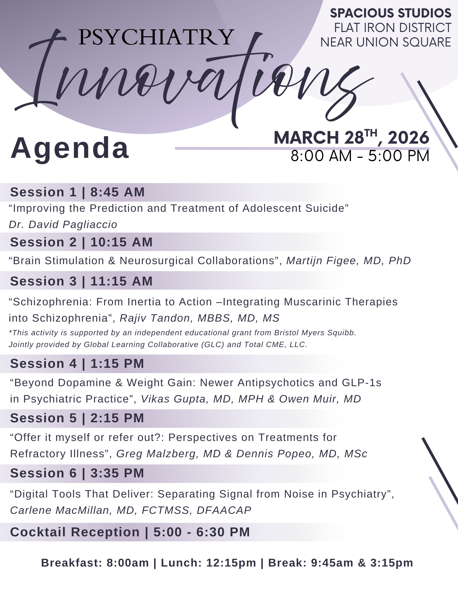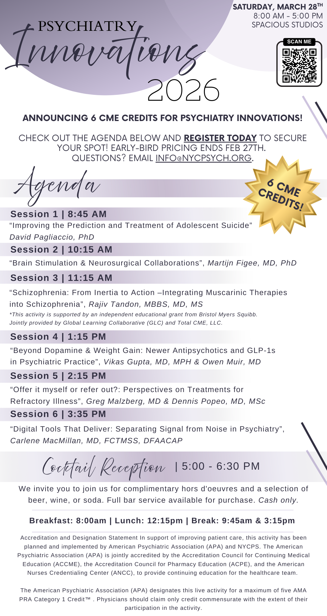 Details Agenda Registration Information Vendor & Exhibitor InformationPsychiatry InnovationsJoin us for our brand new event, Psychiatry Innovations on Saturday, March 28, 2026, for a comprehensive, all-day conference focused on cutting-edge advancements in psychiatric care. This event is your prime opportunity for: